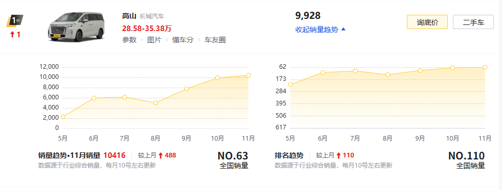 值得一提的是,魏牌高山分别在10月份和11月份力压丰田赛那和格瑞维亚,问鼎国内MPV销量冠军。其中,11月份销量达到10416辆。