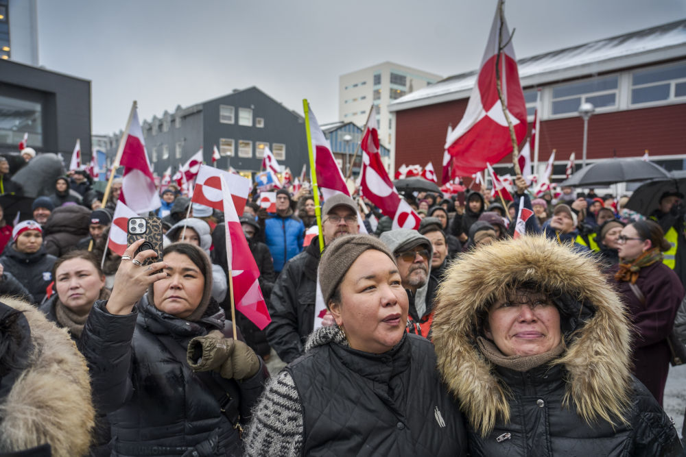2026年1月17日,人们在丹麦自治领地格陵兰岛首府努克参加示威游行。当天,丹麦本土与格陵兰岛多地举行示威游行,抗议美国企图“控制”或“购买”格陵兰岛。新华社发(孔斯豪格摄)